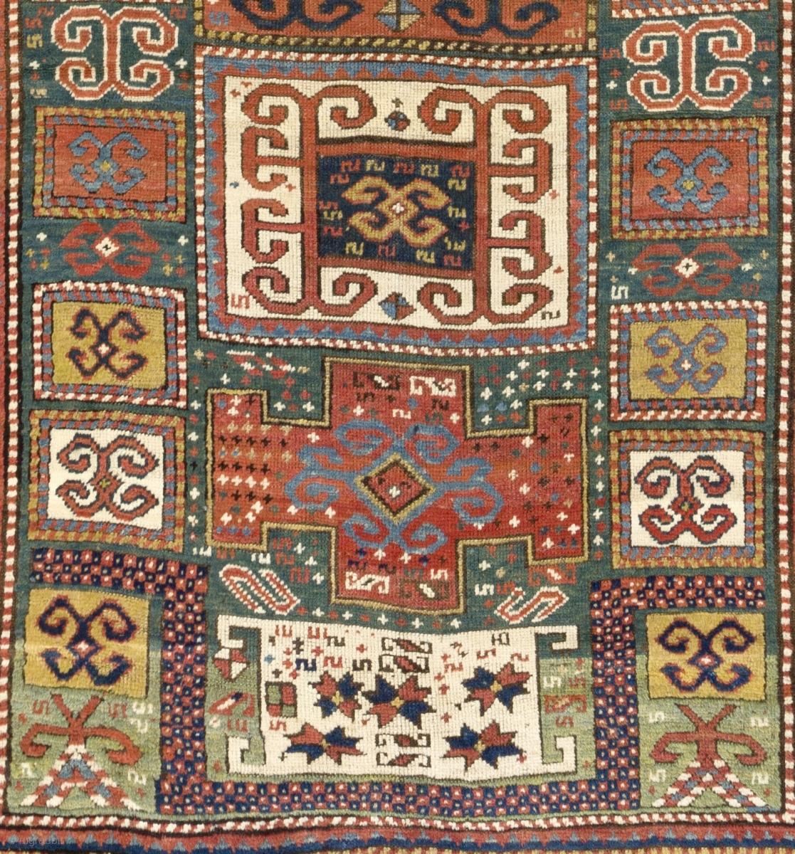 An impressive green ground Karachov (Karachop) Kazak Rug, 4.2 x 8.7 ft (126x262 cm), ca 1875.