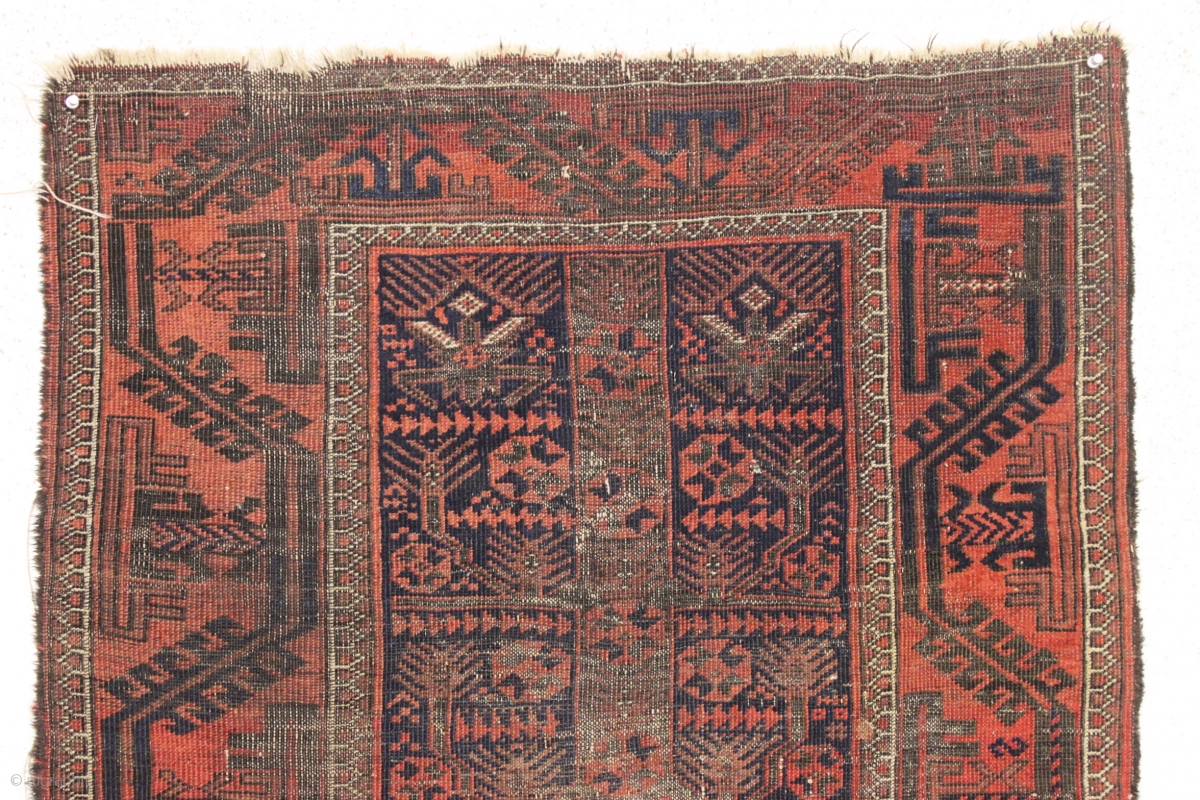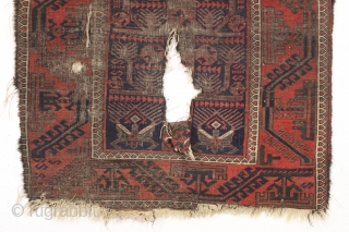antique small baluch rug with interesting design features. Another piece from a local Boston home. In very rough condition but with some powerful archaic elements. Wear and damage clearly shown. Priced accordingly. 19th c. 2'8" x 4'7".