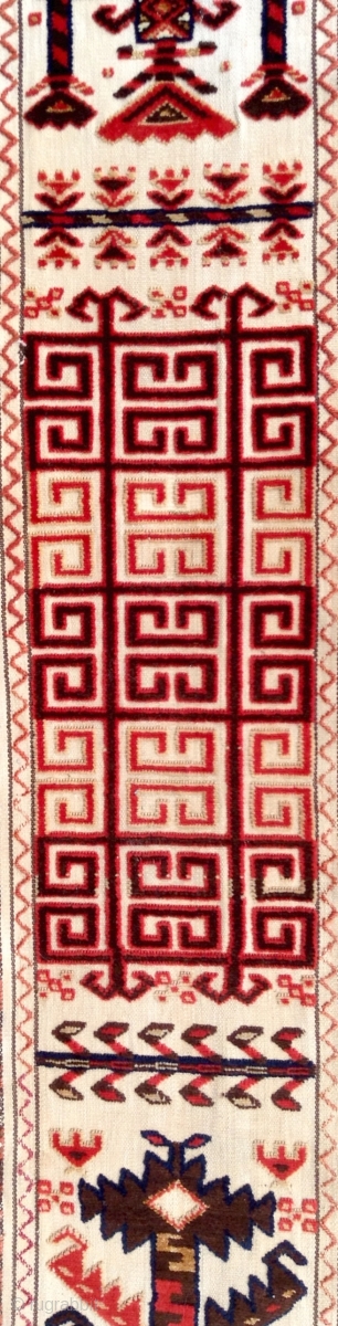 This rare tent band with silk highlights is a survivor from the height of Karakalpak material culture. While, generally, age is associated with quality in Central Asian weavings, in the case of the Karalpak recent research conducted by Sue and David Richardson (published in their book “Qaraqalpaqs in the Aral Delta”) suggests that the Karakalpaks attained material wealth after the Russian Revolution and this tent band, most likely, dates from that time ca.1920-30. The silk pile is primarily a golden-yellow color with a small number of magenta knots. The dyes have been applied skillfully. This tent band was sourced in Eastern Europe where it had been sewn together and hung on the wall for generations judging by the grime on its surface. i had it opened up and washed. Not a trace of bleeding onto the white cotton ground. i have sewn it back together for display, but it could easily be opened up again. The quality of materials suggests that this tent band was something very special. It shows a debt to Turkmen iconography but with its own distinctive twist. It is approximately 30cms wide and 11 meters long. In its current configuration it measures approximately 220x147cms. It its in very good condition with a few tiny holes in the ground and rebound sides.