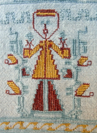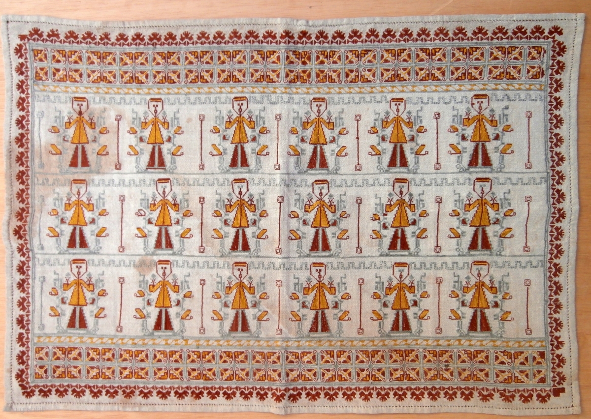 ottoman embroidery which is antique and dates from the late 19th century. It is probably from the Greek Island group of the Dodecanese which were part of the Ottoman Empire of the period. The design shows repeated portrayals of an eminent man dressed in the style of the time with a pill box shaped hat and flowing three quarter length coat. He appears to be holding objects which could be lamps or flowers in each hand. The linen base has exceptionally fine silk embroidery for the designs. There is a piece which is plate 44 of "Embroidery of the Greek Islands" by Roderick Taylor which has very similar borders both in design and color. It is attributed to the nearby Cyclades Islands. Page 18 of the book "Greek Style" shows a man wearing the clothes depicted here. Reference 2811. Size 36 x 52 cms., or 14 x 21 ins. Euros 155. sold thank you.