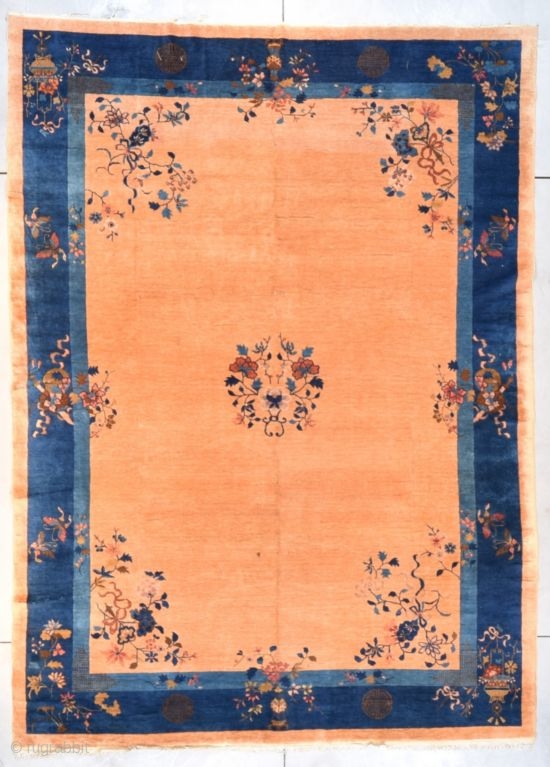 This circa 1900 Peking Chinese Oriental rug measures 9’0” x 12’5” (274 x 381 cm). It has a small medallion of a wreath of flowers on a field color like a pale tangerine sherbet. The corners are worked in a floral motif in three shades of blue, purple, red and ivory. The major blue border has a hanging lamp in two corners and a nice little floral motif in the opposite corners. The border displays the character Shui meaning good luck or happiness. The long borders contain four butterflies and a nice rendition of a beribboned sword piercing two orbs over a flowing ribbon surmounted by a very attractive spray of flowers. It is full pile with complete ends and sides. It is clean and ready to go. The buyer pays the shipping with insurance.