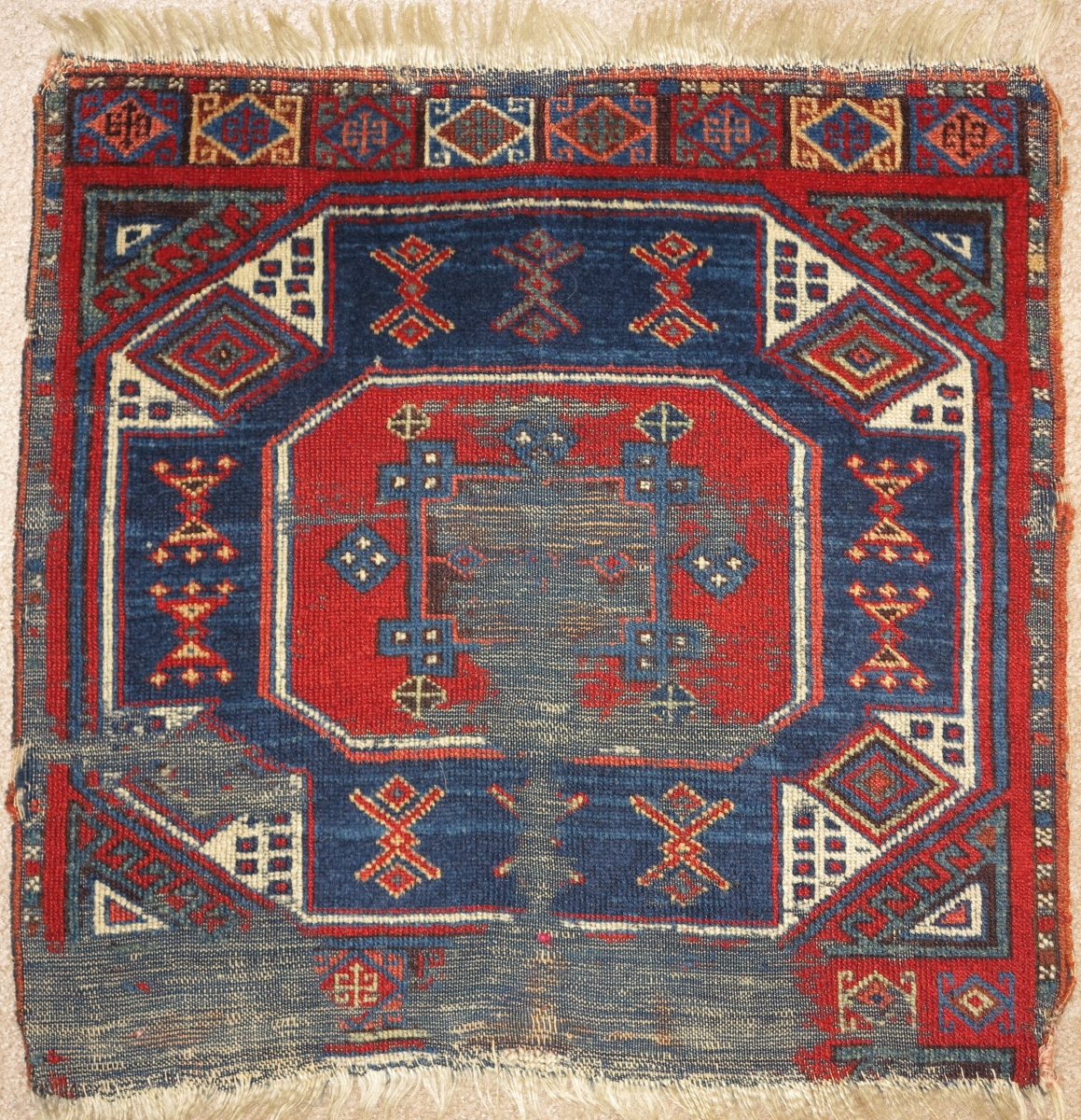East Anatolian rug fragment, very fine weave and saturated natural color. An exceptionally elegant but battered older example of an iconic type.