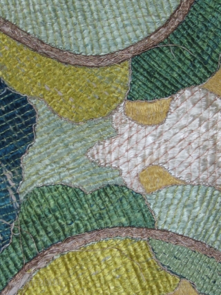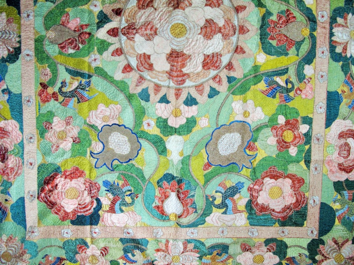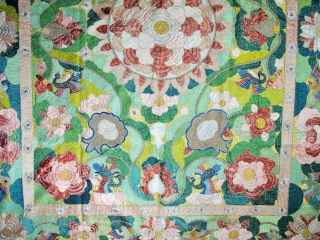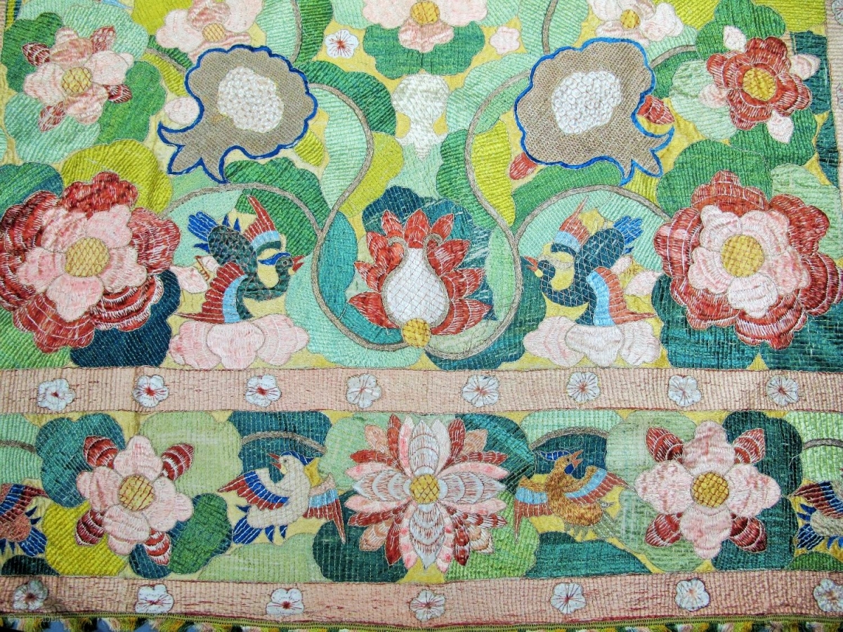 Silver and polychrome silk floss embroidered hanging in the Chinese manner. a large central peony is framed by pairs of birds, lotus flowers, clouds and phoenix, all derived from the Chinese Taoist tradition and eight Buddhist auspicious symbols. Also evident but more discretely are pomegranates and the pious pelican, obviously referring to the western Christian world. This subtle blend of iconography was produced in Macau for the Portuguese market until the mid-seventeenth century. The Dutch, the British and the French soon dominated this "new world" trade commonly as the East India Company. Excellent condition conservation and colors.