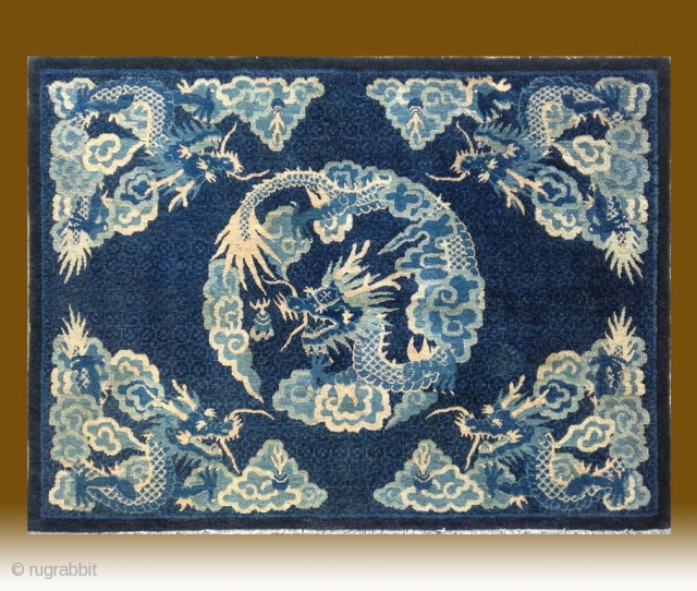 No.CL059 * Chinese Antique Rug "Dragons + Clouds" .Size: 112x152cm(3'8" x 5'). Age: Early 19th Century. Origin: Baotou-Suiyuan Shape: Rectangle. Background Color: Blues.