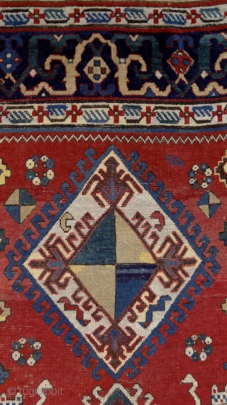Shulaver Kazak rug, Cacasus, 19th century with fantastic cloud-band borders, a straight line from the anatolian middle-age weaving traditions. Very well preserved condition, healthy side cords and ends. Lower pile in the field, meaty in the borders. Shiny wool, saturated all organic dyes. More pieces: http://rugrabbit.com/profile/5160