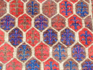 Baluch small rug, 30 x 56". Humble little rug with a tile/shrub design. Low pile with some knot collars showing and some corrosion of browns - priced accordingly.