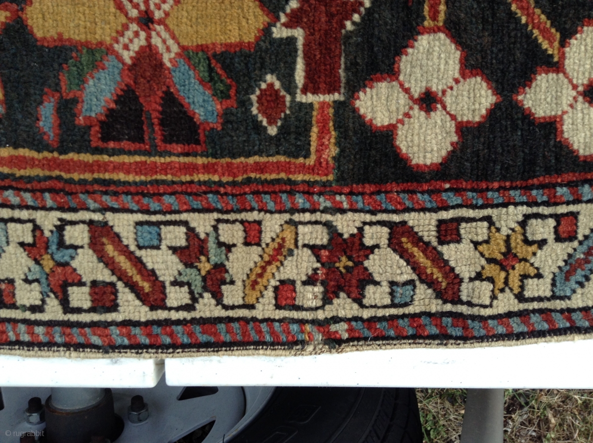 Marasali, Caucasion, 1890's 45" x 55", medium pile throughout, some wear on selvedges, some wear on ends, one end has wear into first black row. other end has complete pile end. One end has 3" slit repair, pictured. Rippon Boswell a87/13 had sold similar one. Great color and pile. i don't have a smart phone, i check my e-mail daily. Thanks