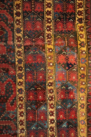 Have you ever seen such a complex border system on that type? Dozens of scorpions (?) in border’s partly blue water. The random use of the blue (throughout the field and within the borders as well) makes the surface looking like weaving water or the vibrating sky. The field is very dynamic and has a lot of asymmetry. Cleverly drawn with a lot of visual fantasy. Not just repeating lines of snakes as we can see it often. Note how the weaver continuously shifted the horizontal and also the vertical axes of the carpet! The form, the scaling and the direction of the snakes are also different from each other, giving real motion and dynamism to the carpet. condition: Wool on wool , with all organic colors. Worn, low pile but still has some meat in the borders. Some ugly, old repairs here&there, but nothing is missing, the piece is complete. More beauties here: http://rugrabbit.com/profile/5160