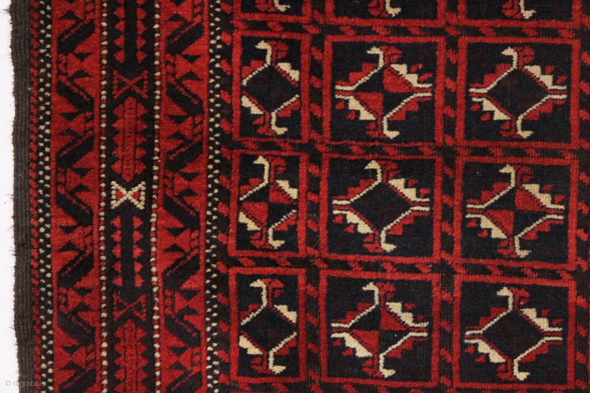 Old Baluch rug with an interesting design, full pile, and overall very good condition. All good old colors. From a local home, not yet washed. Excellent floor rug. 3"2" x 5'6"