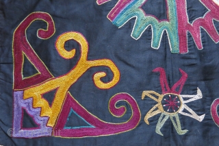 Uzbekistan Lakai - Kungrat tribal wall hanging. silk embroidery on fine cotton with dyed cotton tassles. Circa 1900 or ealier. size : 21" x 19.5" - 53 cm x 50 cm
