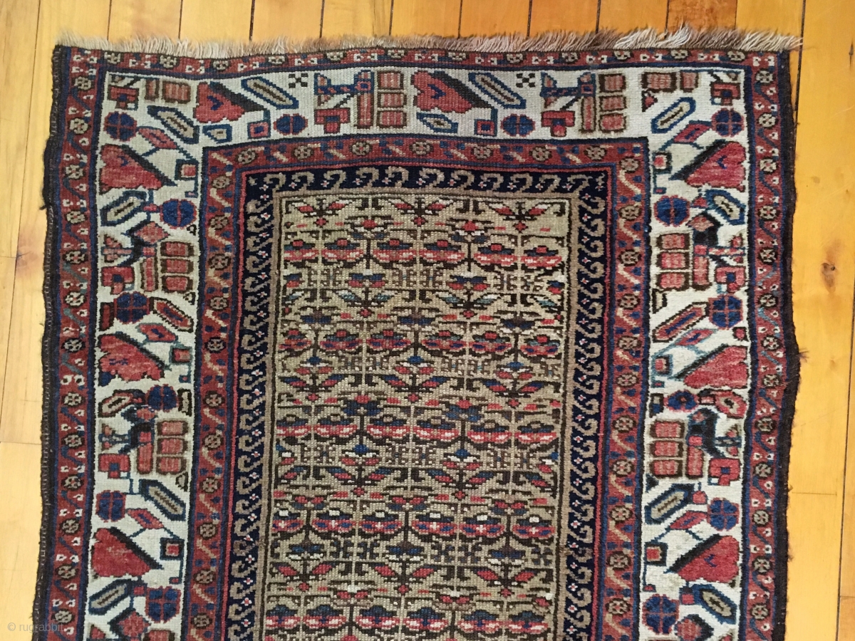 Older northwest Persian or Kurdish runner with camel ground. Overall fair condition with overall even low pile. Good colors. Interesting ivory main border. Little wider at one end. Little wiggly but reasonably flat on floor. Ends have minor loss. Priced accordingly. Ca, 1900. 3'3" x 9'10"