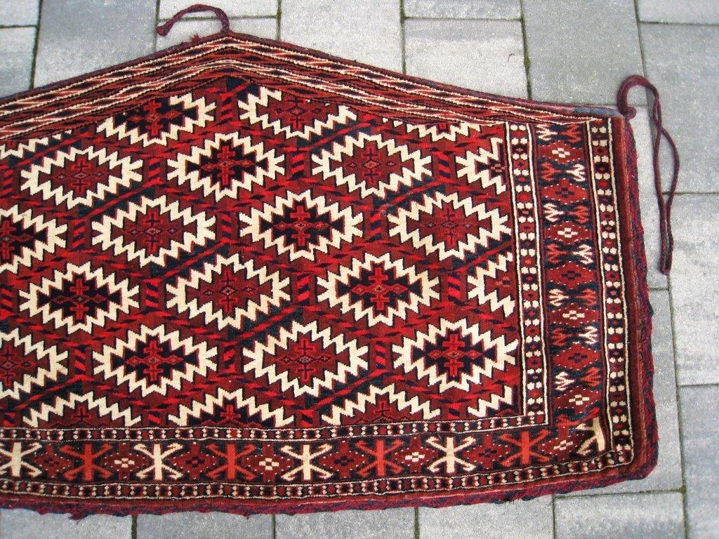 Antique Yomut Asmalyk in nearly mint condition. Very nice natural dyes with remarkable blues and blue-green. Only a couple of tiny moth bites, no holes (Pictures). No damages. Professionally cleaned.