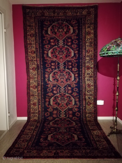 An antique Kömürcü Kula rug with 343/143 cm. Good shape with original endings and some spots of wear. No tinting. Some good old repairs. On wool foundation.