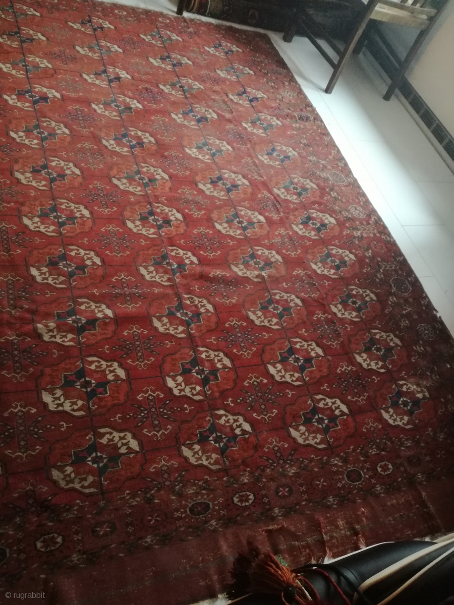 19th century Tekke carpet, 270/220 cm. Dirty, with demages. Very fine weaving.