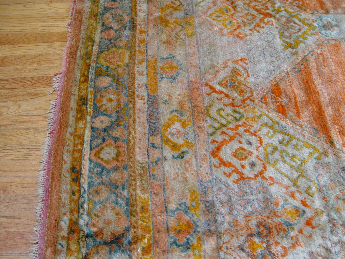 Antique Angora Oushak rug, 8'2" x 10'9" , Circa 1880's, made of 100% wool both pile and foundation, hand washed and cleaned professionally, full pile however shows a very small areas of lower pile on one end and a minor area next to the binding.