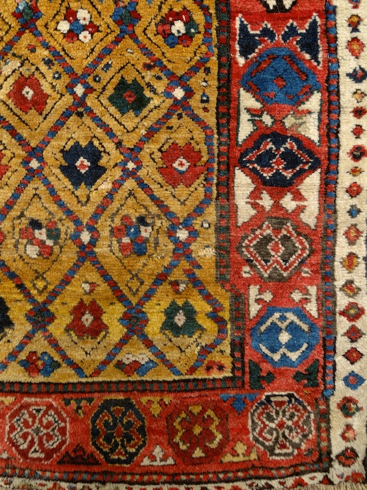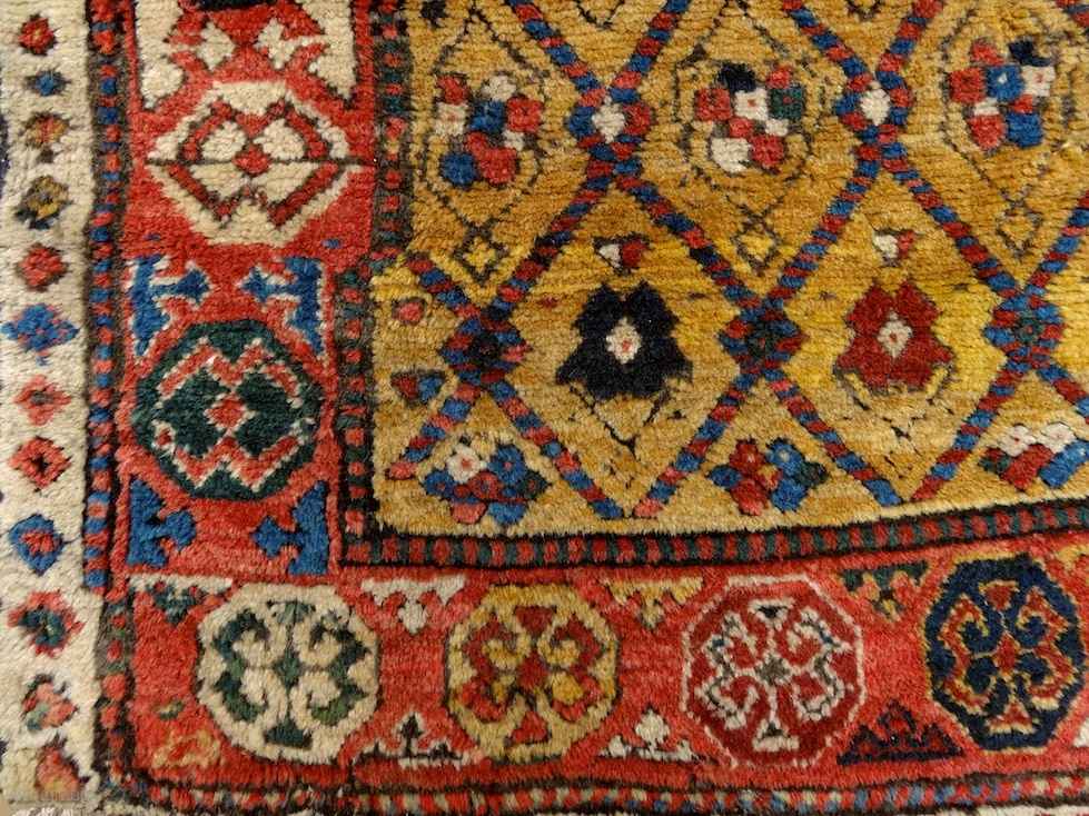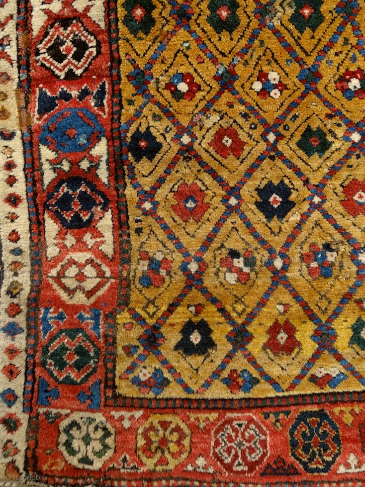 "Sleep is the best meditation." - Dalai Lama. ‘Yatak’/sleeping rug, Caucasus, Zakatala, early 1800’s. Extremly meaty/long pile all over, old reapirs as you can see on the pics, glowing / saturated / vivid/ early colors, very couurse weave: 3-4 rows of dark brown weft ... soft / shiny wool, a real pleasure for barefoot ... an early, honest, rare, artistic, tribal work of art. More beauties on sale: