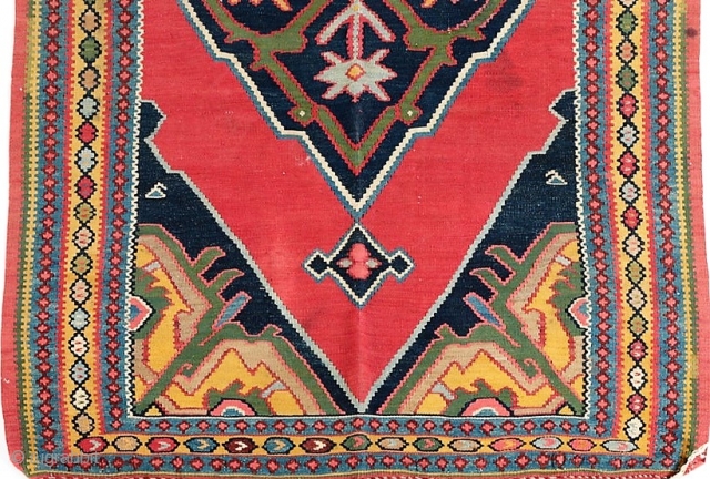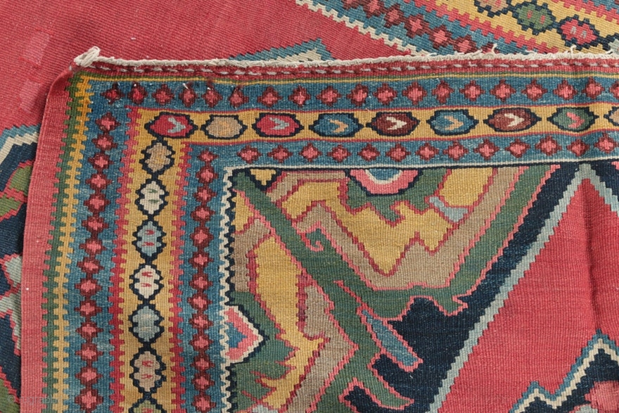 Antique Bidjar kilim runner, circa 1890-1900. All natural dyes, including a beautiful yellow gold and green. Birds in the central medallion. Some old repairs. 46" by 180".