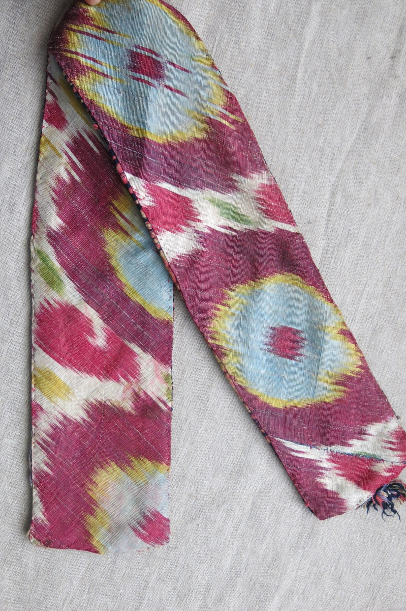 Uzbekistan Bokhara silk cross stitch embroidered belt, backing ikat has replaced with an old one. natural colors, no wool corrosion. circa 1900 or ealier - size : 30" x 3.5".