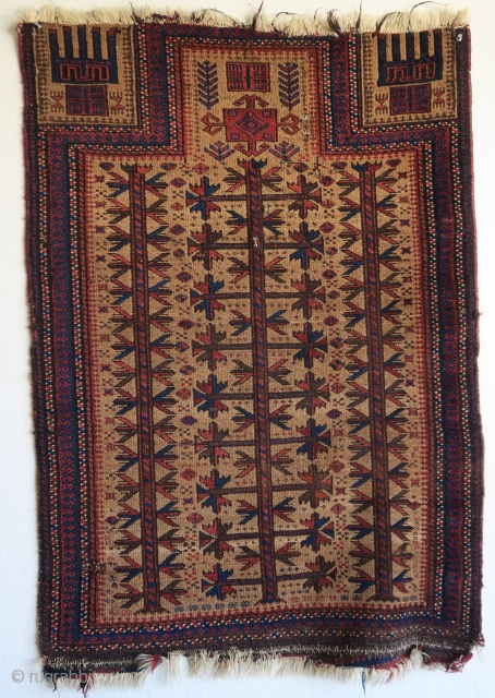 small camel-ground Baluch prayer rug with nice spacing and great stylized hands. size= 2'8"x3'8"