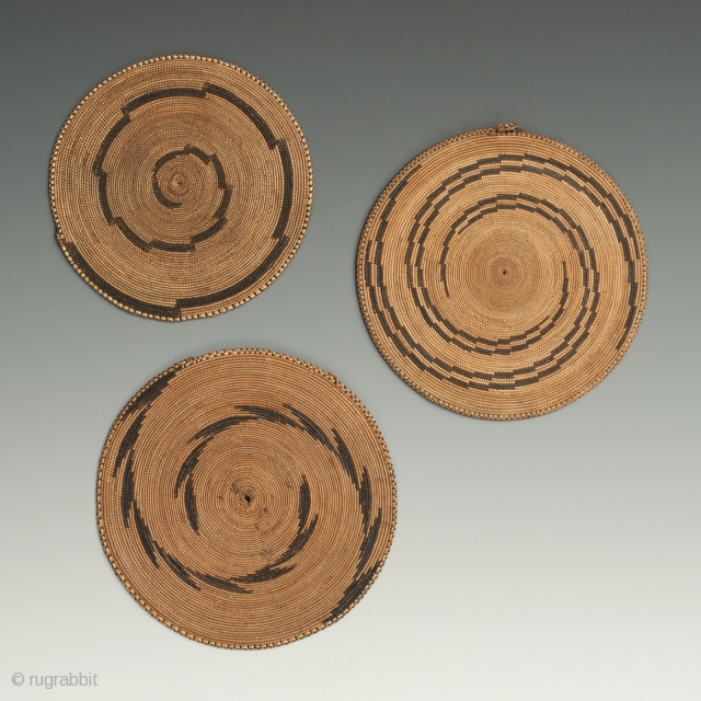 These woven grass presentation plates, "agakoko", were offered as gifts at special occasions. Tutsi people, Rwanda. They measure 4.5" (11.3 cm) to 5" (12.2 cm) and are in beautiful condition. Early to mid-20th century.