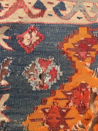 i bought this wrecked kilim 'cause i liked it with the idea of having it restored one day. More than 30 years passed by and i haven't done anything. Anatolian, wool, cotton, metal thread.