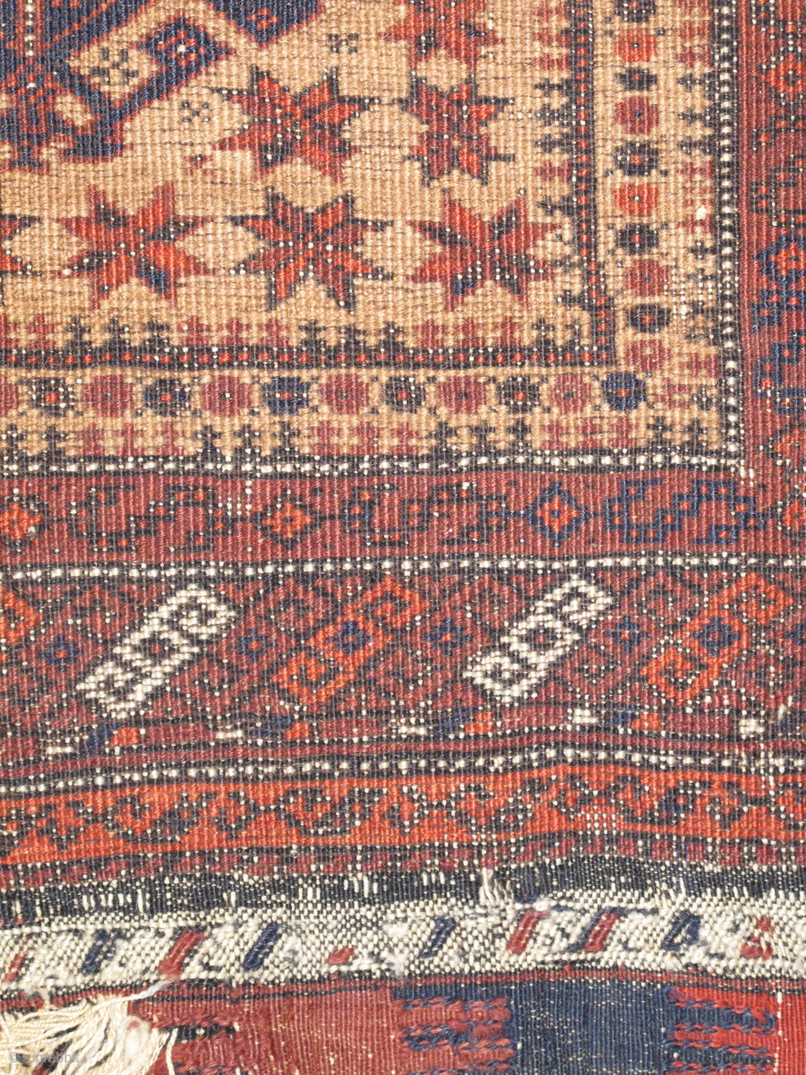 Crisply drawn Camel Ground Baluch Prayer Rug with elongated stylized hands, depressed warp Khorosan type. Dated Baluch prayer rug, a piece from Basha's Baluch Collection. 2'7"x4'7"