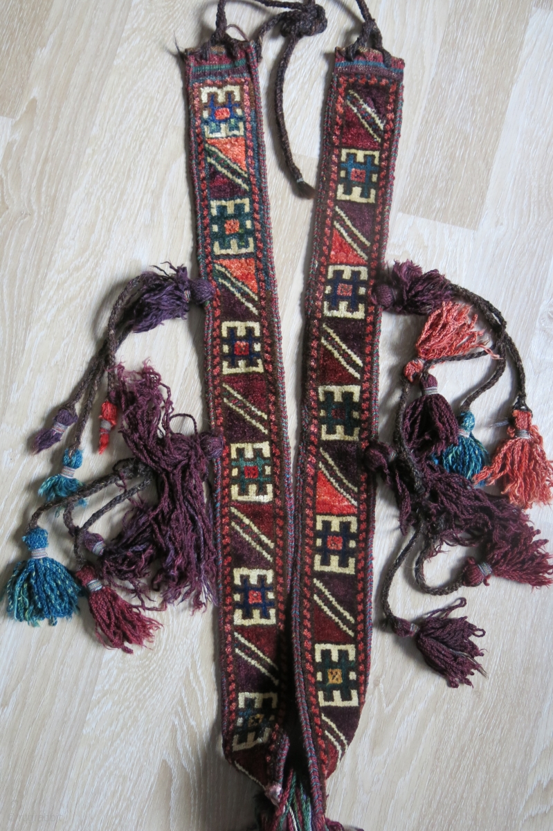 Afghanistan Baluch tribal animal pile ceremonial trapping, all natural colors with thick wool tassels. Washed and frozen. Circa 1900 , Pile part 35" - 90 cm long. tassel part is 25" 65 cm long