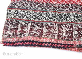 Peruvian woman's mantle, mid-20th century. Great graphics with human figure on horseback. a little over 40" square. Good condition. Please ask for additional photos if needed.