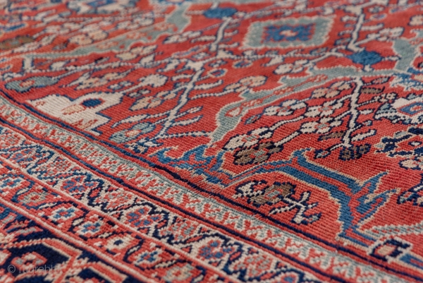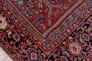 This high quality west Persian village carpet displays a good madder red field with an allover pattern of green lozenges and bars, eight palmette radiating arrays and lobed ivory small medallions. The blue-black border shows well-drawn turtle palmettes in burnt apricot, straw and blue-green. The condition is quite good, with slight overall wear and the colours are excellent and from natural sources.
