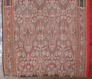 A large Iban woman’s skirt, woven in deep brown, brick-red and ecru ikat. The design is exceptionally detailed, consisting of elaborate rhomb motifs, interspaced by sets of coils whose organic form contrasts with the geometric rhombs. Fine feathery dark lines filling up the intervening spaces are an unusual feature which create a soft delicate effect not generally found in Iban textiles. The central diamonds are marked by blue highlights. The design appears to extend into the borders, with a central border of a feathered angular meander in the same style as the design field.