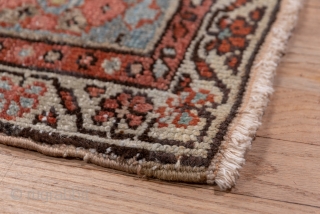 We might term this a 'Serapi', but 'Heriz' will do. This rural nw Persian carpet presents a green octogramme medallion with tonally matching ragged palmette pendants on the mellow madder ground. The light blue corners and border details, along with the natural dye palette overall give this carpet a softer, aged appearance. The condition is generally low, with dots of foundation visible.