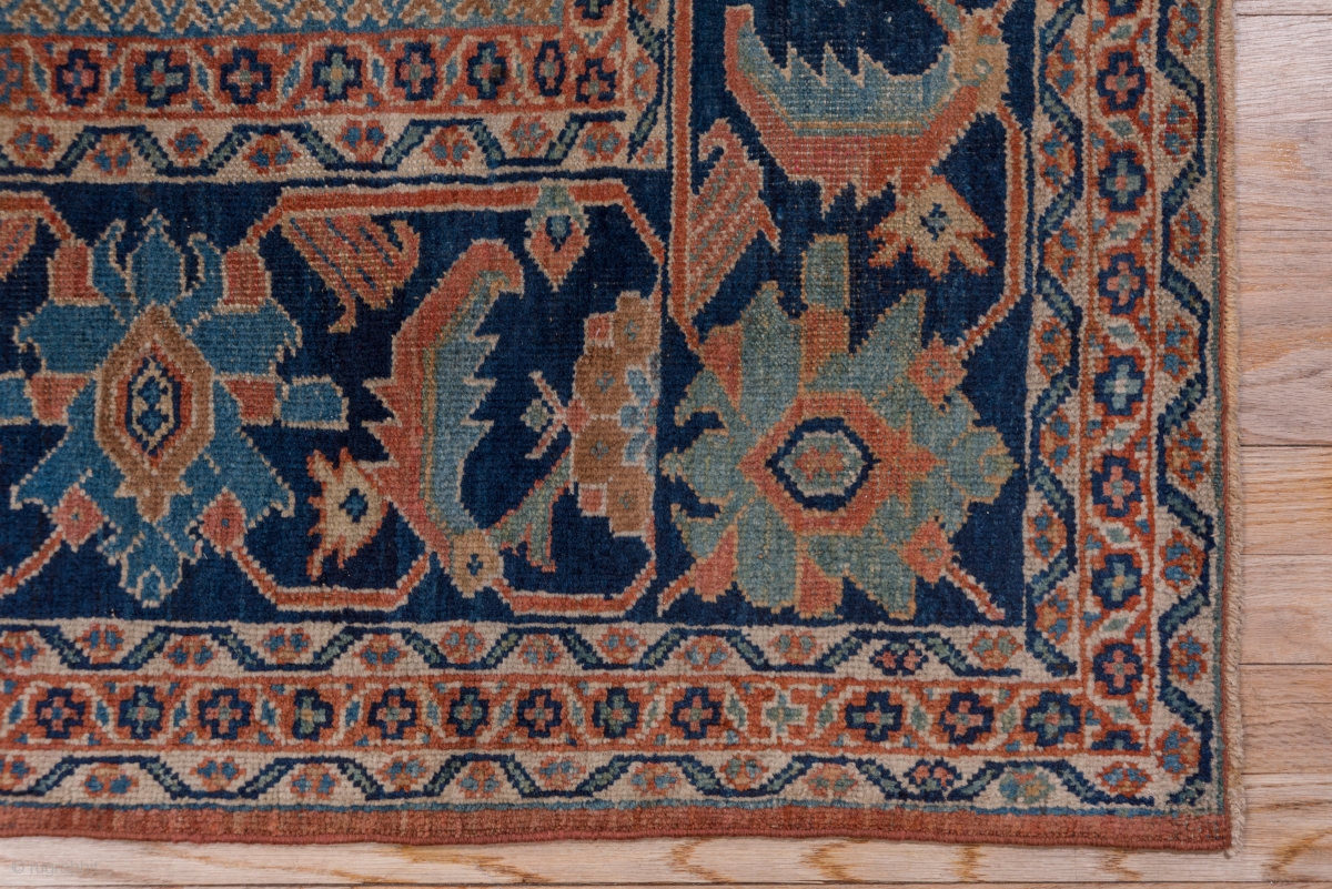 This well-woven and attractively coloured west Persian village Mahal has a pattern of alternating rust/rose lobed panels and ivory concave reserves, both filled with symmetric full flower and broken vine decors. The royal blue main border features angular palmettes, large rosettes and bold two tone lancet leaves. The pile is slightly ow, but the complex pattern is sharp and all details are clear.