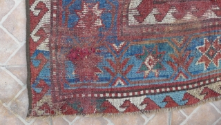 Bordjalou Kazak 215 x 112 cm (7.05ft x 3.7ft) with pre -1900 liveliness. The design with hooked diamonds and medallions on an abrashed blue ground. The field with animals, combs, herding sticks and scattered flower heads. Attractive star main border, with bold, multi-colored 'running dog' sub borders. Areas of wear and one old crude repair.