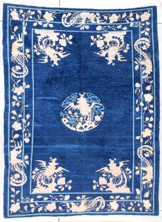 This late 19th century Peking Chinese Oriental Rug measures 6’4” x 8’5”. It has a dark blue variegated field with a corner motif of phoenix birds perched in a tree growing out of a rockery. This motif is repeated in the center circular medallion and is also repeated in a different format in the border. i personally have never seen this motif in quite this layout. The birds in the corners can almost be thought of as sitting on a nest. The one in the center medallion can almost be flying through clouds. The birds in the border are in the horizontal as opposed to the vertical as in the field and they appear to be connected with a flower and vine motif, which in itself is not very common in a rug of his age. While the blue is essentially full pile the mottled ivory has corroded very nicely,serving two purposes. For one, it gives the rug a 3-d effect. And two, it absolutely guarantees the age. The ends and sides are complete. The rug is clean and ready to go. The buyer pays the shipping with insurance http://www.antiqueorientalrugs.com/RMchinese2.htm