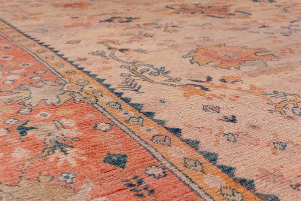 The straw-ivory field of this western Anatolian town carpet displays a generously spaced pattern of Harshang palmettes, flowering branches, floating leaves and a central sharply serrated leafy medallion. The peach border displays broadly drawn palmettes, some transgressing the inner guard, and small ivory rosettes and dark brown elongated leaves.