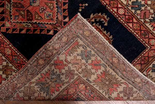 a long pole medallion ending in double hooks is composed of hooked lozenges and stepped octogrammes on the navy ground. Serrated botehs flank the central motif all the way along the field. An ivory border with a Caucasian-style 'crab' border frames the whole of this runner from a village under Heriz influence. This rustic runner is in fairly good condition with small worn areas, but well preserved dark blue.