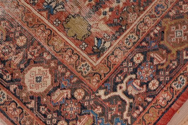 This shabby chic condition carpet shows a madder field with larger and smaller rosettes, little botehs and chevron-detailed palmettes. The corroded brown border shows a classic turtle palmette design with boteh-style 'fish' leaves. There are horizontal wear channels throughout the field.