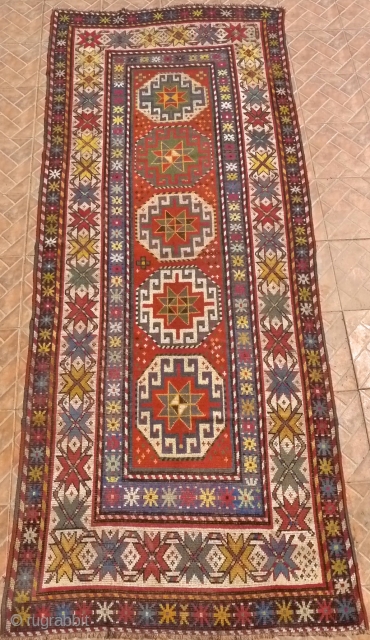 Genje- Moghan long rug, 10ft x 3.9ft (305 cm x 120 cm.) Late 19 th. century.. The design with a single, vertical row of Moghan Memling Guls. Attractice white ground border with linked star motifs. Slight overall wear with a few minor repairs. Price in usd 950 plus 90 p&p