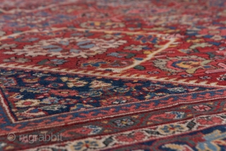 The properly abrashed madder red field presents three columns of four large, ivory open lozenges centred by ivory ragged lozenges. Attractive polychrome leafy plants are paired between the larger motives and there are numerous colourful tertiary motives. The royal blue border features two styles of leaf-bracketed rosettes and tonally matches the small, triangular field corners.The palette is crisply excellent, but there are areas of spot wear in a generally good pile.