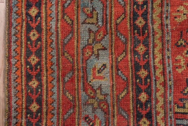 This antique western Turkish carpet features a red field closely covered by alternating columns of palmettes and Yaprak lozenges with an attractive medium blue-green and a dark greenish blue as well. The blue-green narrow main border, of nine in all, has an angular meander with buds and stars.For such a coarsely knotted carpet, the condition is quite good and there are no repaired areas.