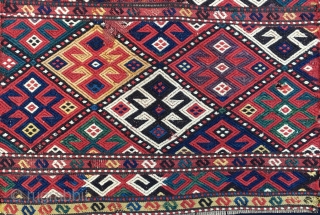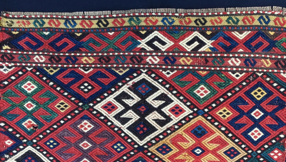 Shahsavan sumack mafrash end panel . Cm 43x53. 2nd half 19th c. Weft float brocading weave. Great natural saturated colors: yellow, madder red, two different greens, deep indigo blue, aubergine, black, white. Condition issues: one small hole, some wool missing in the middle top. See Tanavoli, plate 108. Reasonable price.