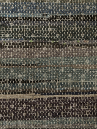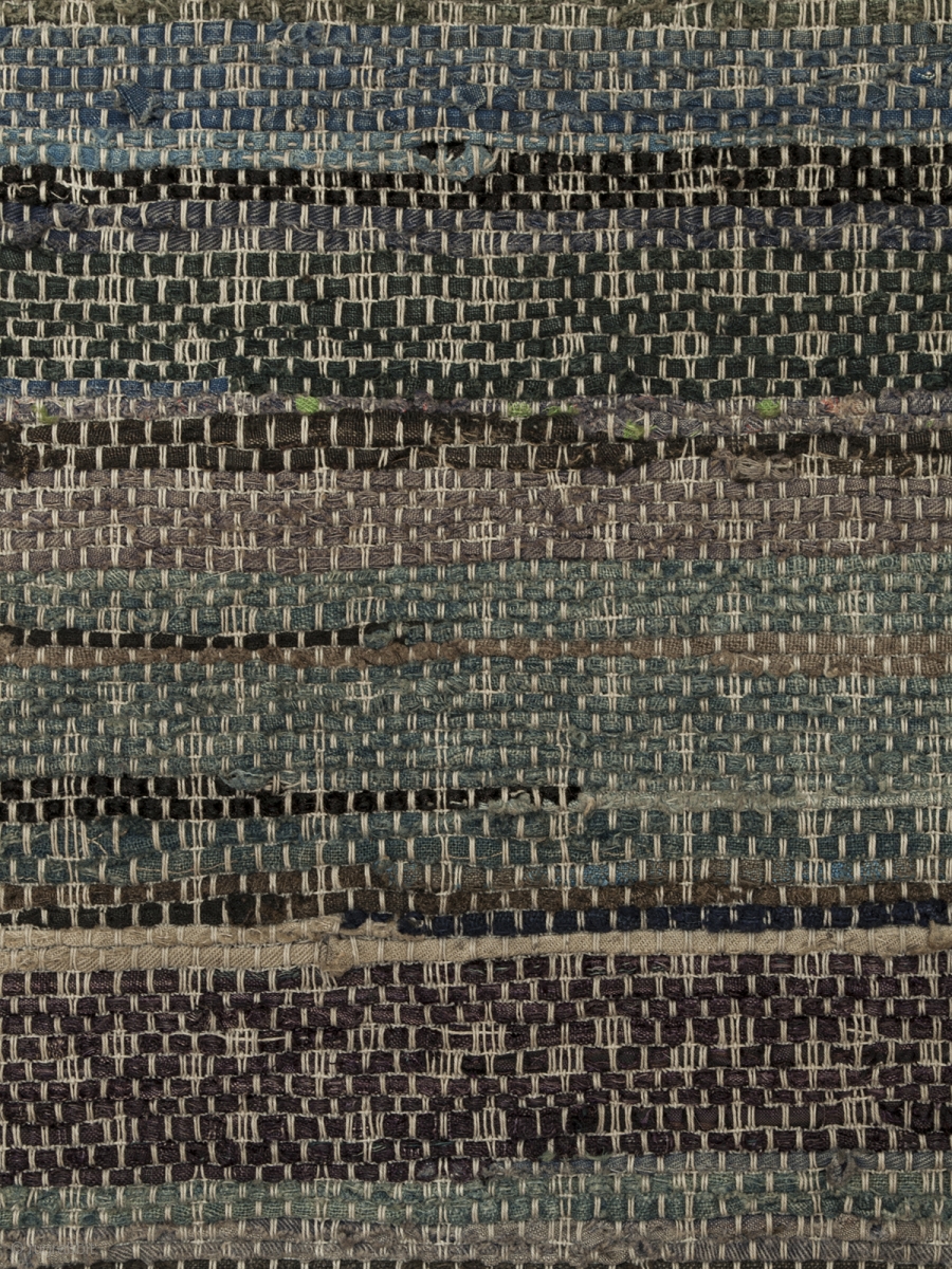 This strip woven blanket is made from recycled fabrics, most of them indigo dyed cotton. It is mounted, but can be easily removed if desired.