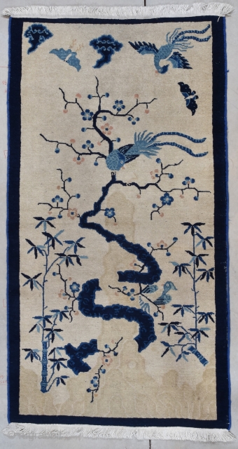 This circa 1910 Peking Chinese antique rug measures 3’1” x 5’10” (94 x 180 cm). It has bamboo growing up the sides of the field flanking a twisty tree in blue growing out of a rockery. There is a duck perched at the bottom and a pheasant sitting at the top with another one flying above in the right corner and two butterflies dancing about. All is on an ivory ground with a narrow blue border. The sides have been overcast. The rug is slightly low in a few places. It is clean and ready to go. The buyer pays the shipping with insurance.