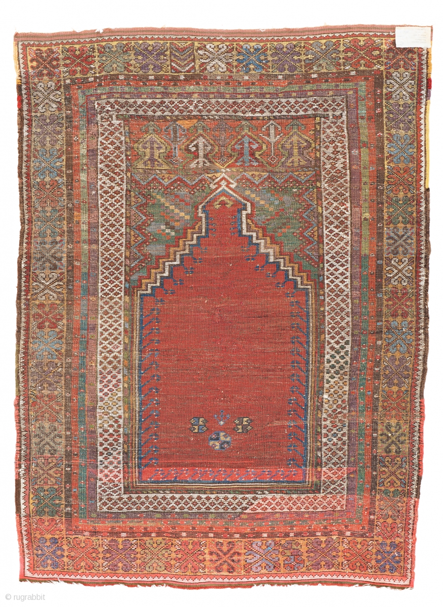 Lot 14, Mudjur Prayer Rug, 5 ft. 1 in. x 3 ft. 10 in., Turkey, ca. 1870, condition: good, ends restored, some repairs and reweavings, Warp: wool, weft: wool, pile: wool, Provenance: Theo Häberli private collection, Starting bid: € 300, Auction September 29th, 4pm, https://www.liveauctioneers.com/catalog/127157_fine-antique-oriental-rug...