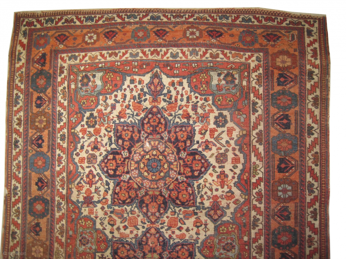 the knots are hand spun wool, the warp and the weft threads are 100% wool, vegetable dyes, the black color is oxidized, the background color is ivory, surrounded with warm rust and ivory, the center two medallions are indigo with terracotta, the surrounded large border is terracotta and the tiny borders are ivory, at the center the pile is slightly short, one of the corner is damaged to be repaired, very fine knotted, rare example and soft as an handkerchief.