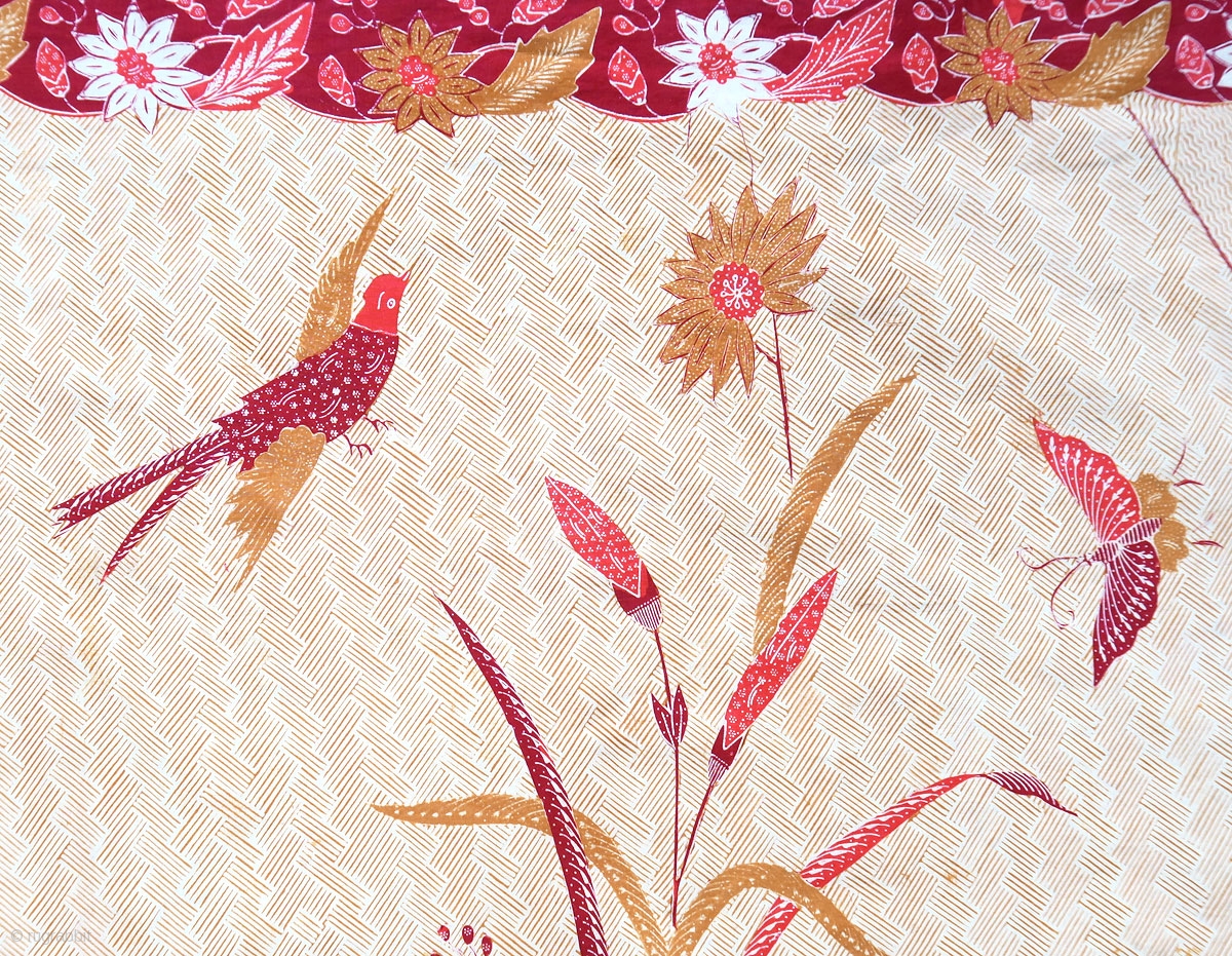 A fine hipcloth hand-drawn in Pekalongan on the north coast of Java, in a format called pagi soré, i.e. “morning / evening”: the cloth is bisected along a diagonal line, each half decorated with a different pattern, thus giving the wearer a choice of 2 hipcloths depending on which half was shown on the outside. One half has two and half repeats of a large bouquet of feathery chrysanthemums, with a butterfly hovering over it, against a diamond grid of wavy lines; the other half has more solid flowers and leaves, with a bird and a different butterfly hovering above, on a basket-weave background. Correspondingly, the piece has two different borders, each extending along one long and one short side. The design is distinctive for its combination of lacquer red, coral pink and caramel, which is an Indo-Dutch color scheme, and for the movement incorporated in the picture that suggests a breeze passing through the bouquets. There is an indistinct printed name of the batik-maker along one border.