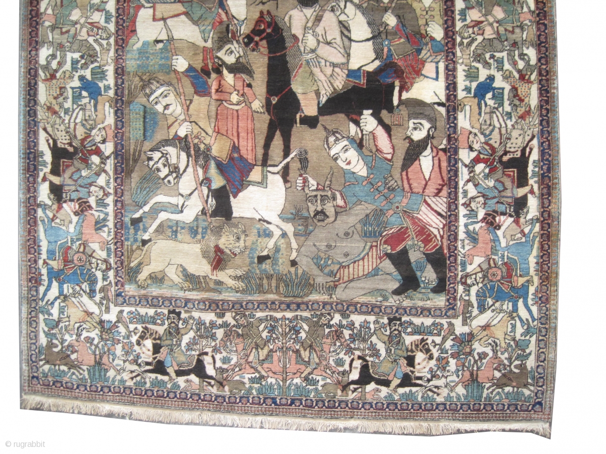 Historical subject,the background is camel hair, at the center designed the king with his family members, advisors, soldiers on horses, lion, the surrounded large ivory border is designed with fighters on horses, very fine knotted, 640'000 knots in square meter, high standard quality, the carpet is in original shape. a single example. More pictures are available.