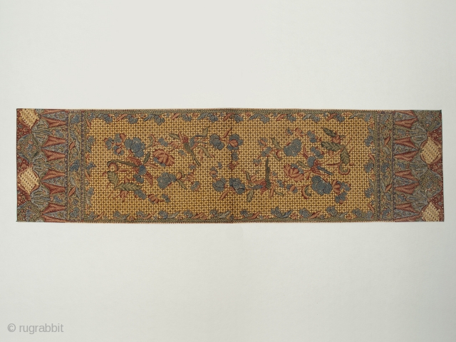 There is no damage, but for one small white dye skip that you can see in det3 in the second cartouche from the bottom. The long edges are very finely machine stitched and the short edges are selvage.