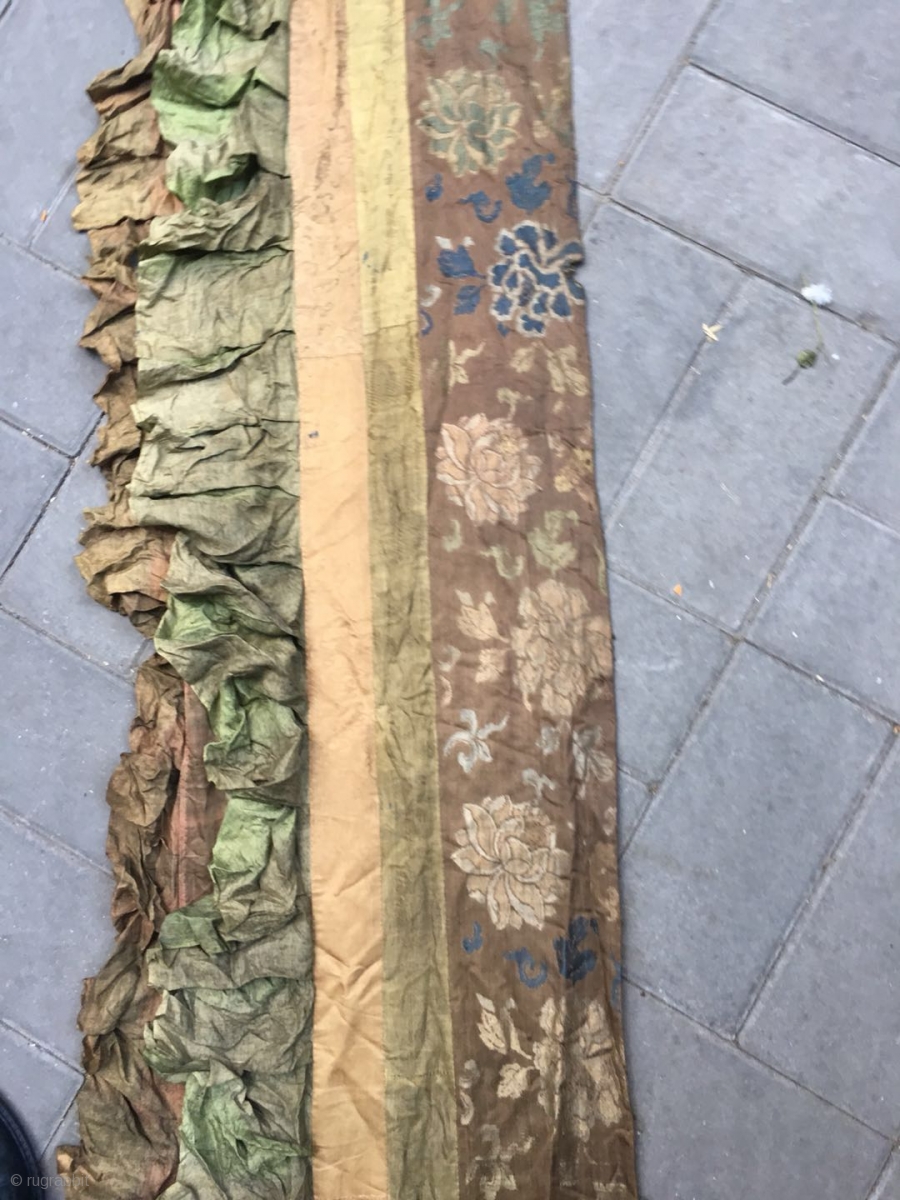 Tibetan draperies,it hanging on the top of the wall in Tibetan temple. handmade silk fabrics, colorful buddhist lotus patterns, and also have shallow lotus flowers on the two narrow strips in the middle. Very rare one. Good age and condition .Size 540*480cm.