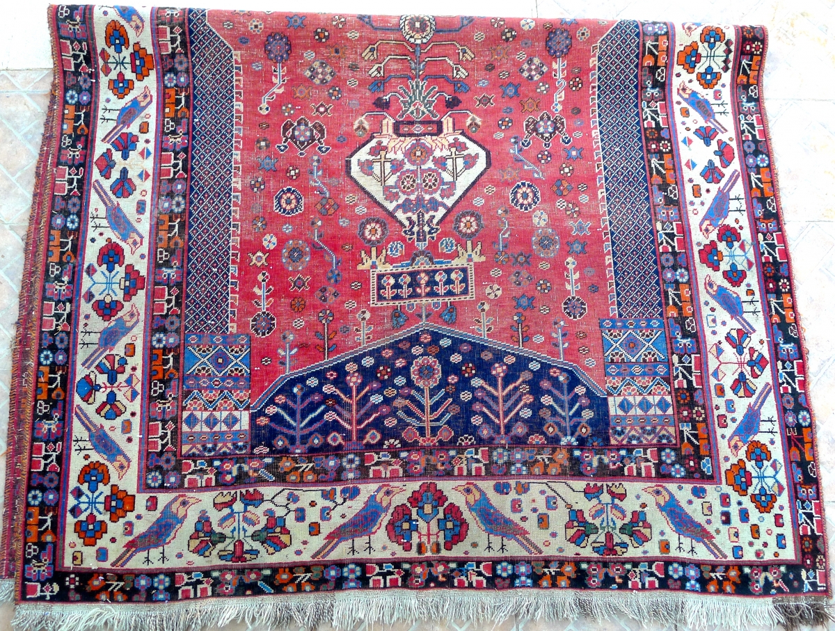 Qashqai Kashkuli carpet, 270 cm x 175 cm. The design with two opposing vases, flanked by columns, Atractive white ground border with bird motifs. Overall low pile. $395 plus 75 p&p, insured